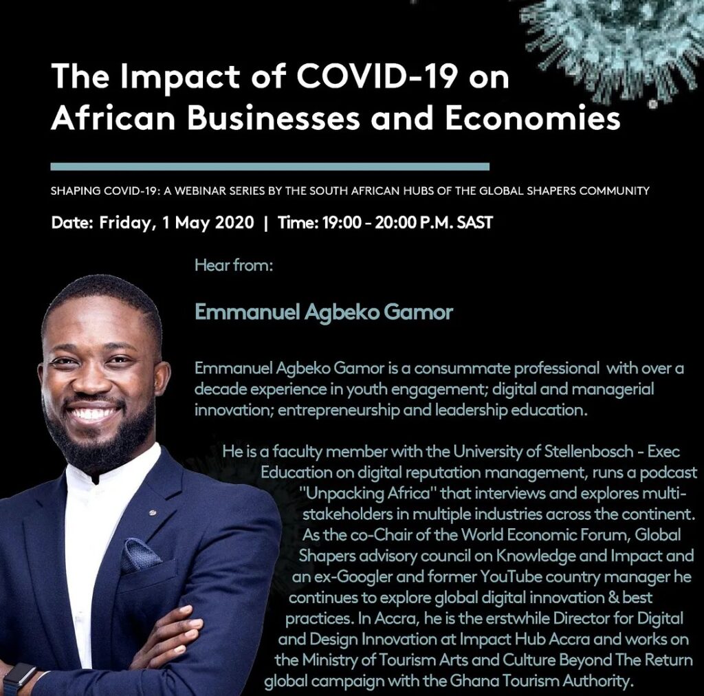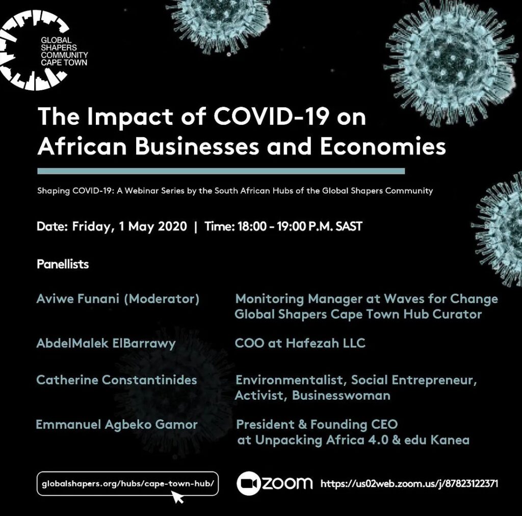 1. Find your tribe, huddle (digitally), and let’s pull together ideas for our own community interventions to our problems. I’m participating in a webinar that jump-starts my May 1st on Zoom with my Global Shapers in South Africa tribe, on “The Impact of Covid-19 on African Businesses and Economics” and you may join in here: